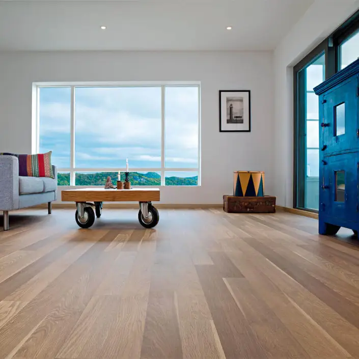 De naturelle kleur laat zich makkelijk combineren met vele andere kleuren en stijlen. Zo kun je gemakkelijk een zeer strak en moderne inrichting met deze vloer combineren. Hoogglans witte meubelen of meubelen met rvs, alles past erbij. Toch liever een klassiekere inrichting? Ook dat is prima te combineren! Al met al vinden wij deze kleur vloer het makkelijkst combineren van alle vloeren.