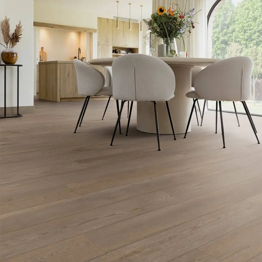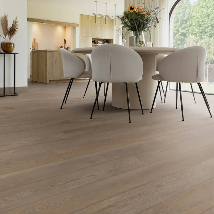 De naturelle kleur laat zich makkelijk combineren met vele andere kleuren en stijlen. Zo kun je gemakkelijk een zeer strak en moderne inrichting met deze vloer combineren. Hoogglans witte meubelen of meubelen met rvs, alles past erbij. Toch liever een klassiekere inrichting? Ook dat is prima te combineren! Al met al vinden wij deze kleur vloer het makkelijkst combineren van alle vloeren.