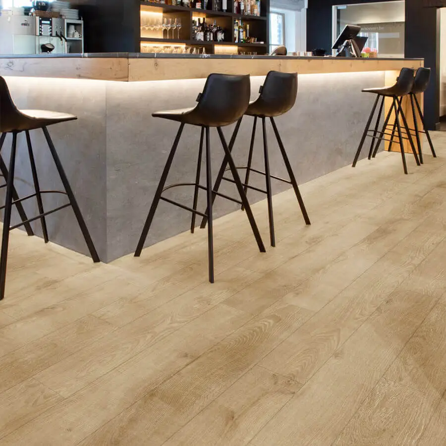 Wil je wat meer rust creëren dan is de gekozen vloer een perfecte keuze. Deze naturel kleurige vloer geeft daarnaast vrolijkheid en energie aan de ruimte en werkt in donkere ruimtes licht verhelderend.
