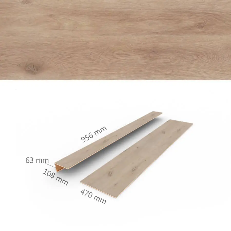 Deze box bevat één trede en één stootbord voor bovenste trede van een trap. De treden en stootborden zijn geschikt voor trappen met een maximale breedte van 1,22 meter. De trede is 10,8 centimeter diep waardoor je een perfecte aansluiting op je bestaande vloerbekleding krijgt! De rand van de trede is 6,3 centimeter hoog. Het bord voor de stootborden is 23 centimeter hoog.