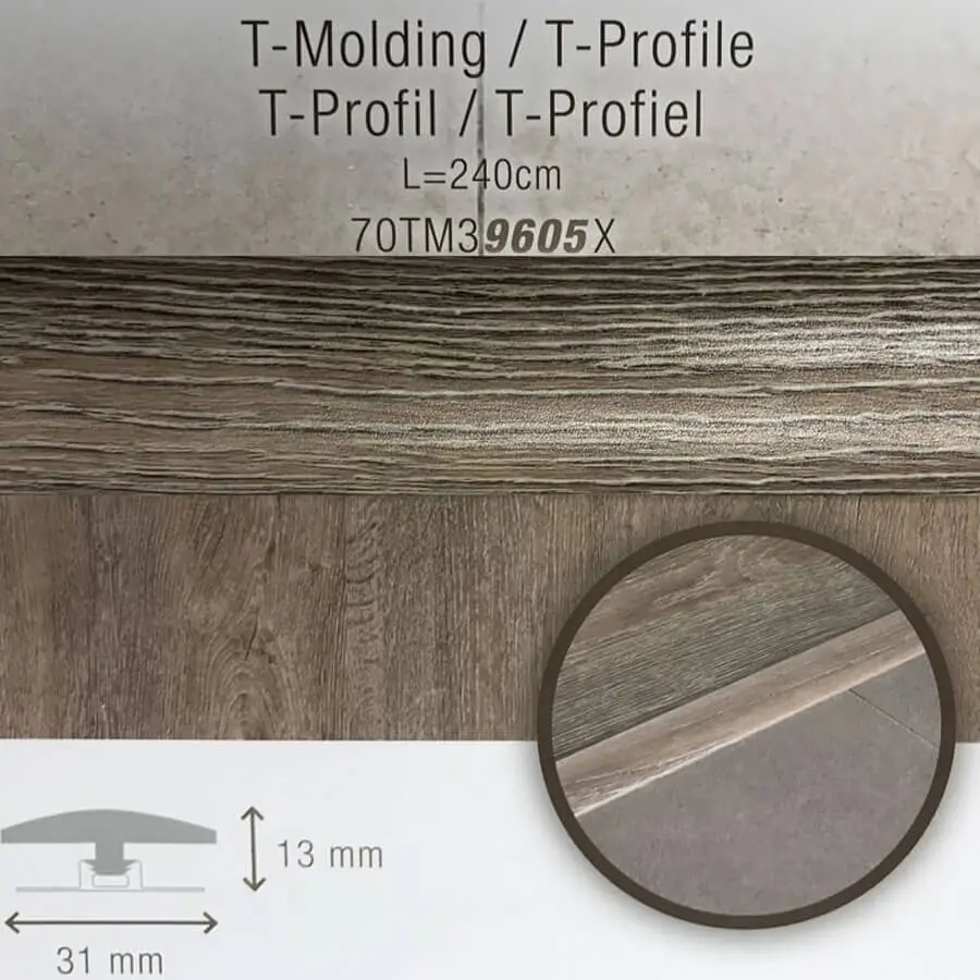 Bij de CoreTec pvc vloeren zijn perfect matchende profielen te verkrijgen. Zo kun je ook het CoreTec T-profiel 240 cm in exact dezelfde kleur en tekening verkrijgen als je pvc vloer. Daarnaast is het T-profiel 100% watervast en net zo slijtvast als de vloer. Het profiel is 240 centimeter lang, 3,1 centimeter breed en heeft een hoogte van 1,3 centimeter. Je kunt het Coretec T-profiel 240 cm gebruiken als dilatatieprofiel onder deuren of andere overgangen van gelijke hoogte.