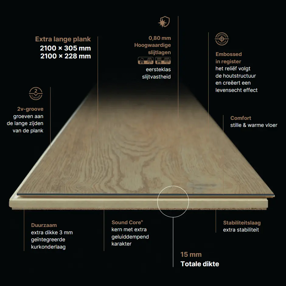 In tegenstelling tot bijvoorbeeld laminaatvloeren en andere pvc vloeren, kan je de COREtec XL-End 50LVREXL 2553 Egmond vloer direct na ontvangst plaatsen op bijna elke ondergrond. Je hoeft niet te acclimatiseren, bijna niet te egaliseren en je hebt geen ondervloer nodig! Heb je een oude tegelvloer? Zitten er scheuren in de betonvloer of ligt er nog een oude vaste parketvloer? Geen probleem, je legt deze COREtec® vloer er gewoon direct overheen! Onder de COREtec XL-End 50LVREXL 2553 Egmond pvc vloer vind je een 3 mm dikke kurken onderlaag. Deze zorgt voor een goede geluidsdemping en vangt kleine oneffenheden op. Daarnaast is deze onderlaag schimmelwerend. De plank zelf is gemaakt van een mengsel van gerecycled hout, bamboe, kalksteen en vinyl wat in de volksmond WPC genoemd wordt. Dit mengsel heeft als voordeel dat het niet reageerd op vocht, zeer sterk is en dat de vloer gemakkelijk te plaatsen is door het geintegreerde klikprofiel. De moderne PVC toplaag en de 0,08 millimeter dikke PU coating maken de plank af. De coating is zeer slijtvast, krasbestendig, vochtwerend en vuilafstotend.