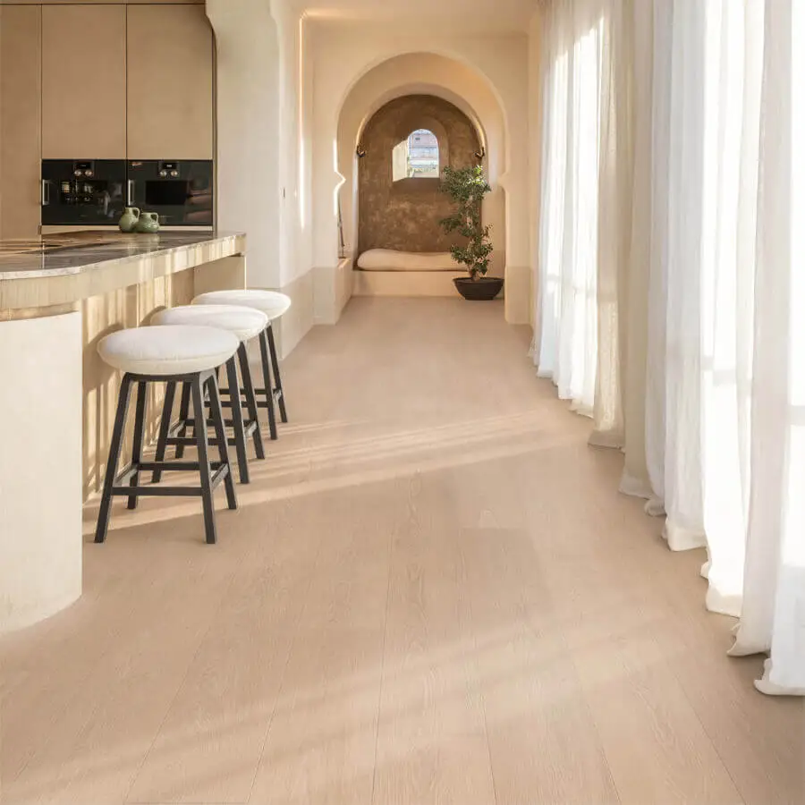 Een lichte vloer zoals deze vloer maakt de ruimtes optisch groter en zorgt voor een tijdloze, heldere uitstraling. Hierdoor is deze kleur uitermate geschikt kleinere ruimtes of ruimtes met weinig lichtinval.