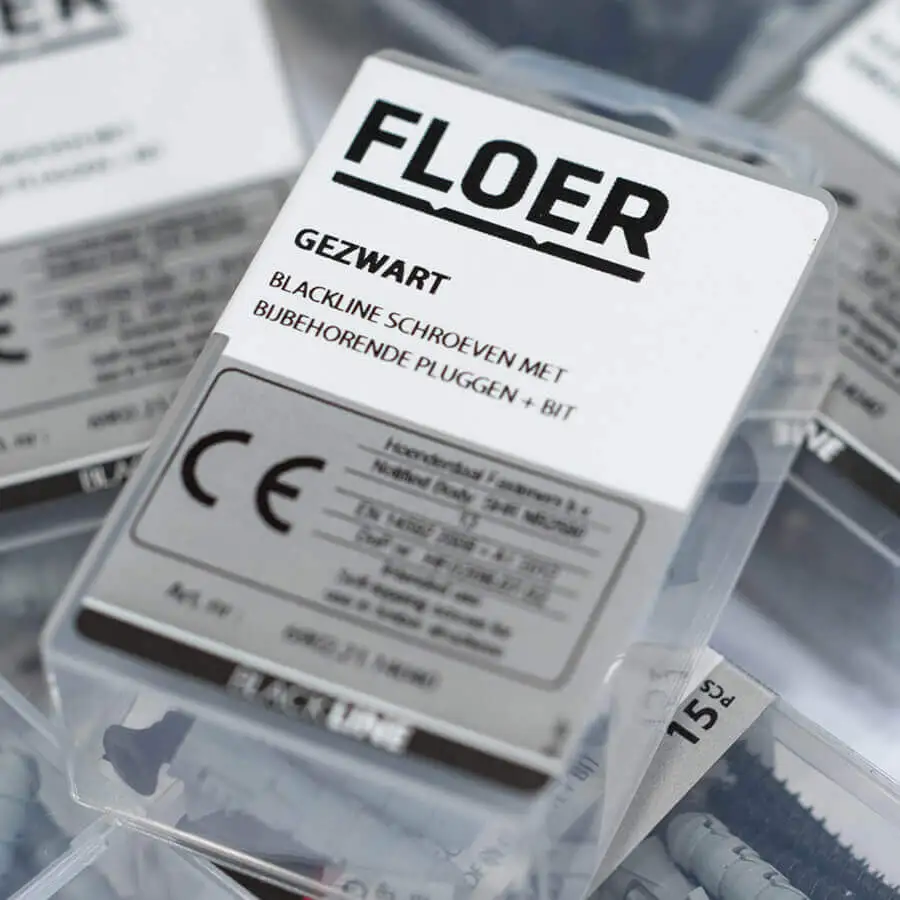 Deze FLOER motage set bestaat uit 15 zwarte schroeven van 4 centimeter, 15 bijpassende pluggen en 1 bij de schroefkop passende bit Dit is normaal gesproken genoeg voor 1 FLOER Wandpaneel te kunnen monteren.