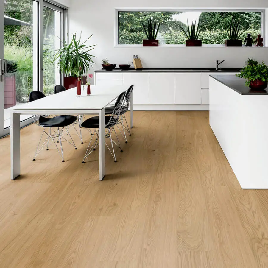 De naturelle kleur laat zich makkelijk combineren met vele andere kleuren en stijlen. Zo kun je gemakkelijk een zeer strak en moderne inrichting met deze vloer combineren. Hoogglans witte meubelen of meubelen met rvs, alles past erbij. Toch liever een klassiekere inrichting? Ook dat is prima te combineren! Al met al vinden wij deze kleur vloer het makkelijkst combineren van alle vloeren.