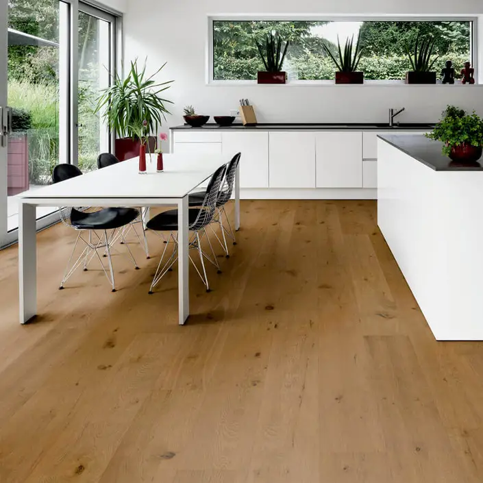 De naturelle kleur laat zich makkelijk combineren met vele andere kleuren en stijlen. Zo kun je gemakkelijk een zeer strak en moderne inrichting met deze vloer combineren. Hoogglans witte meubelen of meubelen met rvs, alles past erbij. Toch liever een klassiekere inrichting? Ook dat is prima te combineren! Al met al vinden wij deze kleur vloer het makkelijkst combineren van alle vloeren.