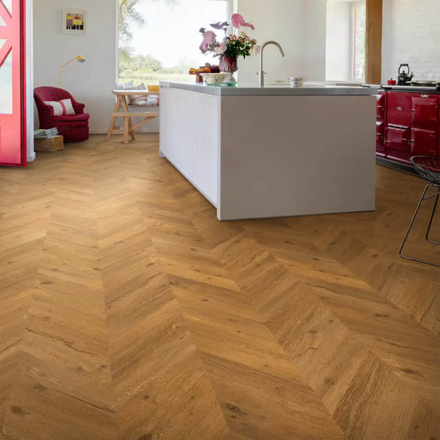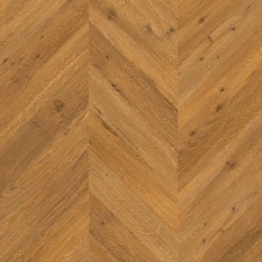 onder een vaste hoek van 45 of 60 graden in een V-vorm gelegd. Hierdoor ontstaat een symmetrisch, strak lijnenspel dat zorgt voor rust en luxe in elke ruimte. Dankzij Floorify kun je dit klassieke patroon nu eenvoudig zelf (laten) leggen, zonder gedoe met lijm of complexe patronen.