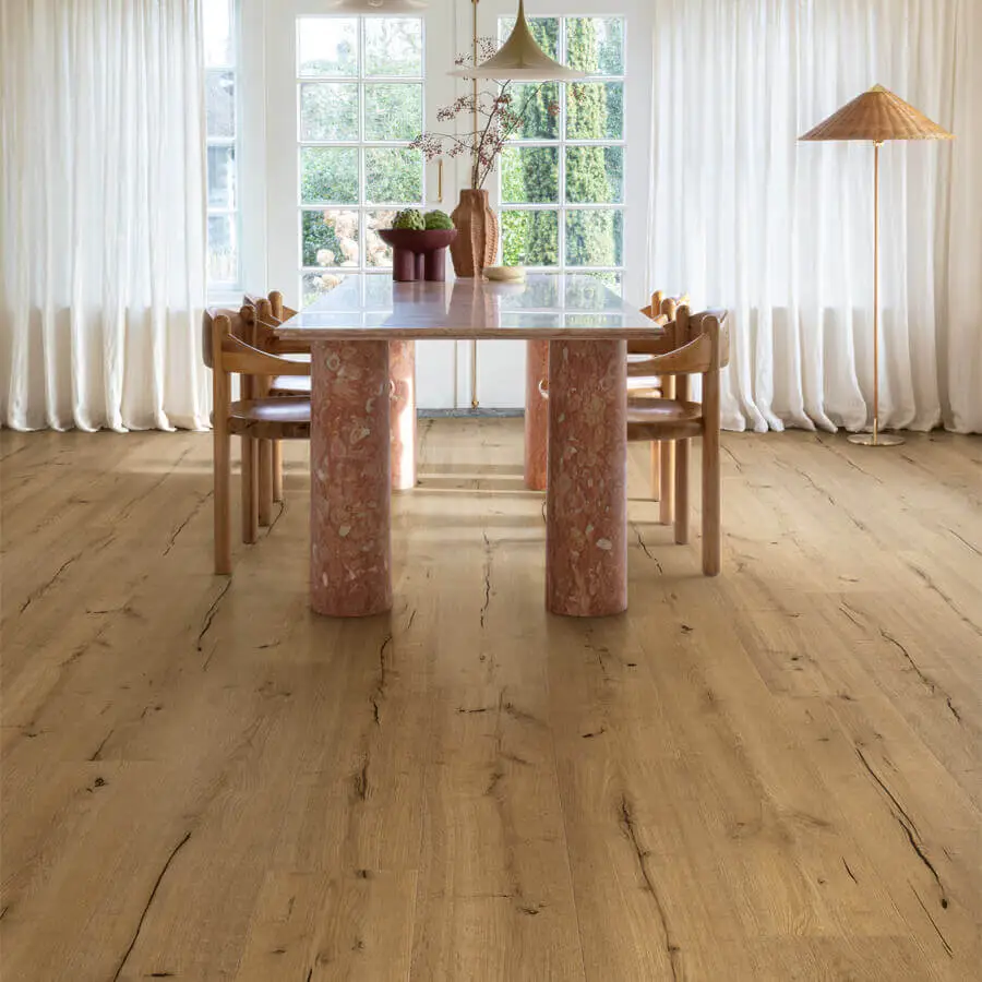 De naturelle kleur laat zich makkelijk combineren met vele andere kleuren en stijlen. Zo kun je gemakkelijk een zeer strak en moderne inrichting met deze vloer combineren. Hoogglans witte meubelen of meubelen met rvs, alles past erbij. Toch liever een klassiekere inrichting? Ook dat is prima te combineren! Al met al vinden wij deze kleur vloer het makkelijkst combineren van alle vloeren.