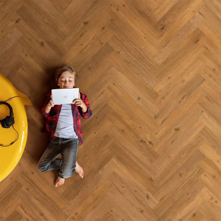 Ontdek nu zelf de kwaliteit, duurzaamheid en stijlvolle uitstraling van deze Floorify Visgraat Gluedown PVC vloer!