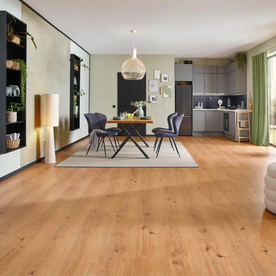 Zo geeft bijvoorbeeld een natuurlijk gekleurde vloer je huis een zachte, tijdloze uitstraling. Denk aan naturel eiken, zandtinten of een warme beige ondertoon. Het effect: meer rust, minder harde contrasten en een interieur dat als één geheel aanvoelt. Vooral in woonkamers en open keukens werkt een natuurlijke kleur als een verbindende factor tussen vloer, meubels, wanden en accessoires.