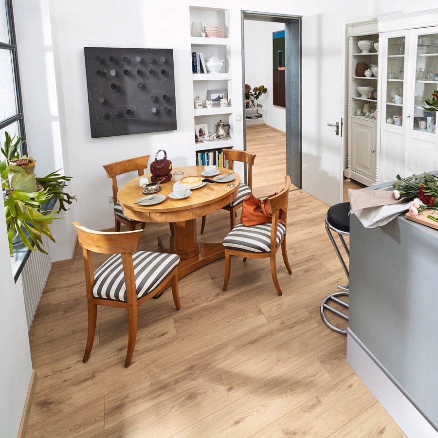 De naturelle kleur laat zich makkelijk combineren met vele andere kleuren en stijlen. Zo kun je gemakkelijk een zeer strak en moderne inrichting met deze vloer combineren. Hoogglans witte meubelen of meubelen met rvs, alles past erbij. Toch liever een klassiekere inrichting? Ook dat is prima te combineren! Al met al vinden wij deze kleur vloer het makkelijkst combineren van alle vloeren.