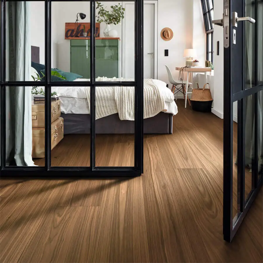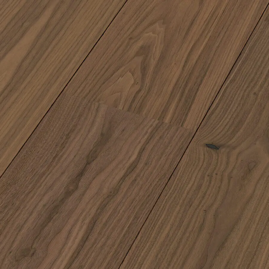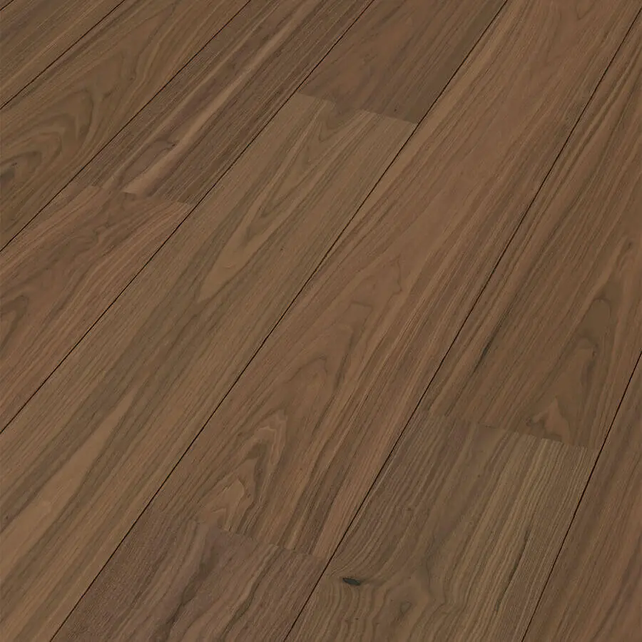 De Meister Lindura HD 400 - 270 Gelakt Amerikaans Notelaar 8912 is een 2,2 meter lange en 27 centimeter brede vloer met een houten fineerlaag gecombineerd met de Wood-Powder techniek. Hierdoor ontstaat een super sterke en drukvaste houten vloer. Lindura vloeren zijn drukvaster dan een houten planken vloer door deze techniek.