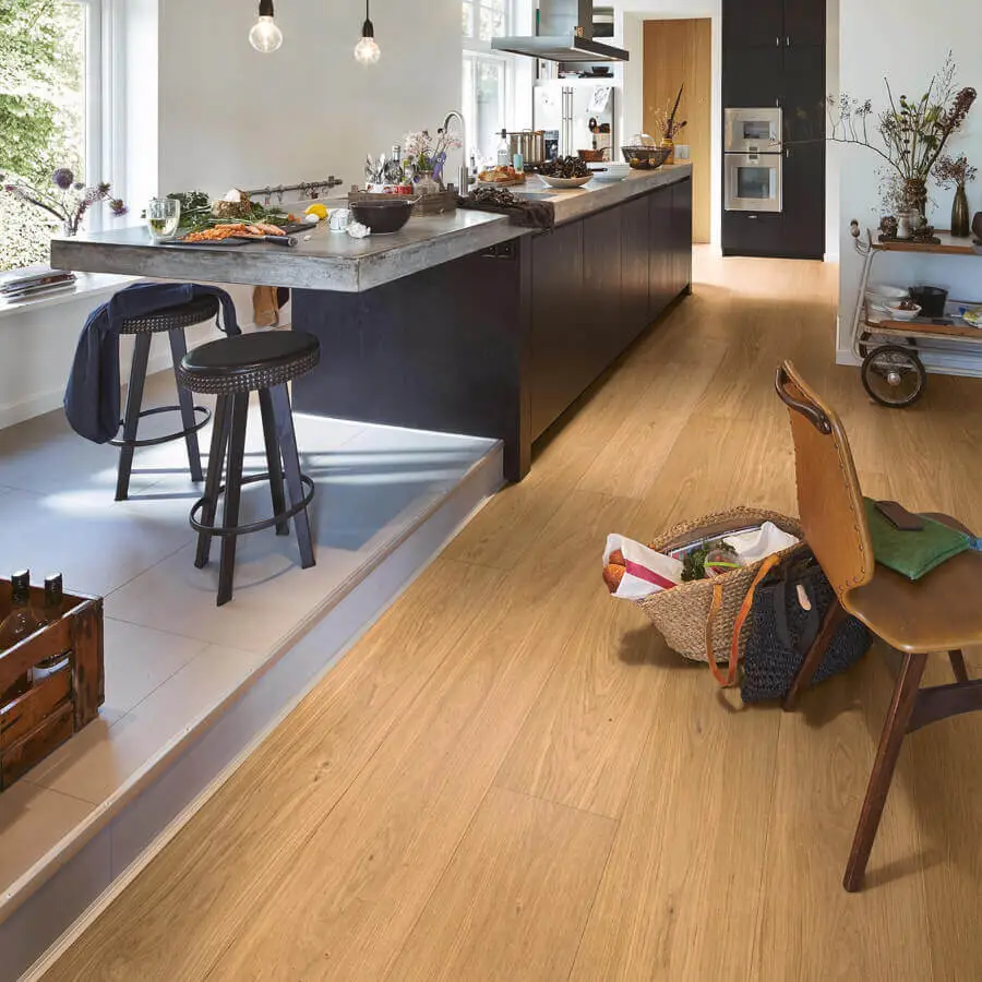 De naturelle kleur laat zich makkelijk combineren met vele andere kleuren en stijlen. Zo kun je gemakkelijk een zeer strak en moderne inrichting met deze vloer combineren. Hoogglans witte meubelen of meubelen met rvs, alles past erbij. Toch liever een klassiekere inrichting? Ook dat is prima te combineren! Al met al vinden wij deze kleur vloer het makkelijkst combineren van alle vloeren.