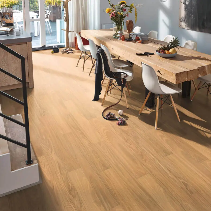 De naturelle kleur laat zich makkelijk combineren met vele andere kleuren en stijlen. Zo kun je gemakkelijk een zeer strak en moderne inrichting met deze vloer combineren. Hoogglans witte meubelen of meubelen met rvs, alles past erbij. Toch liever een klassiekere inrichting? Ook dat is prima te combineren! Al met al vinden wij deze kleur vloer het makkelijkst combineren van alle vloeren.