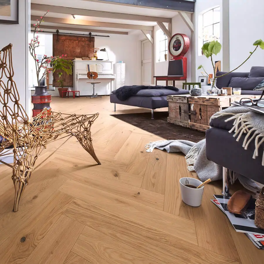 De naturelle kleur laat zich makkelijk combineren met vele andere kleuren en stijlen. Zo kun je gemakkelijk een zeer strak en moderne inrichting met deze vloer combineren. Hoogglans witte meubelen of meubelen met rvs, alles past erbij. Toch liever een klassiekere inrichting? Ook dat is prima te combineren! Al met al vinden wij deze kleur vloer het makkelijkst combineren van alle vloeren.