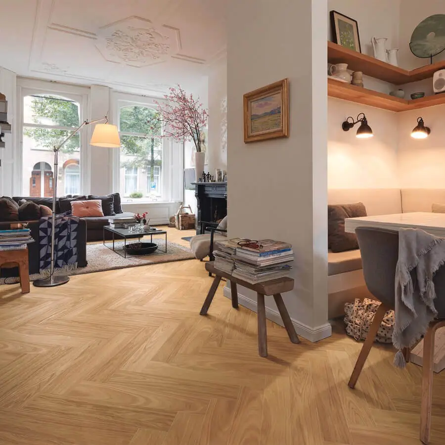 Wil je wat meer rust creëren dan is de gekozen vloer een perfecte keuze. Deze naturel kleurige vloer geeft daarnaast vrolijkheid en energie aan de ruimte en werkt in donkere ruimtes licht verhelderend.