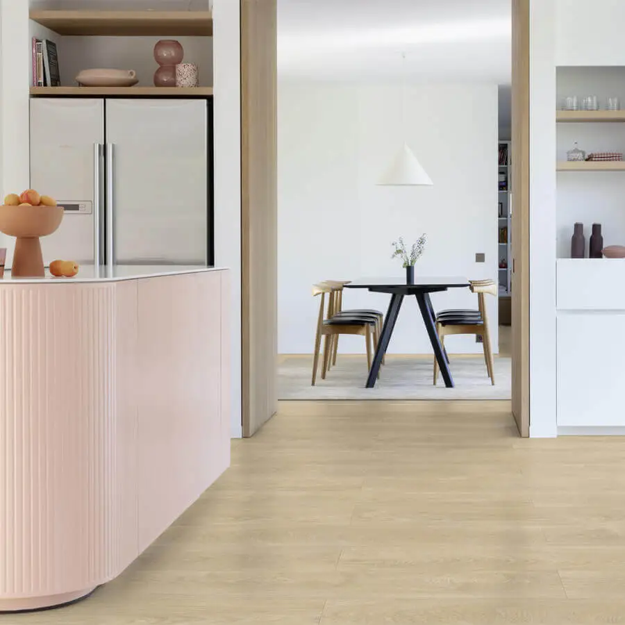 Een lichte vloer zoals deze vloer maakt de ruimtes optisch groter en zorgt voor een tijdloze, heldere uitstraling. Hierdoor is deze kleur uitermate geschikt kleinere ruimtes of ruimtes met weinig lichtinval.
