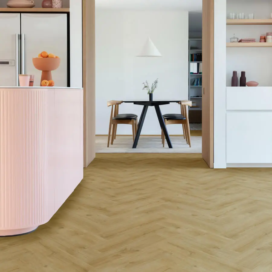Zo geeft bijvoorbeeld een natuurlijk gekleurde vloer je huis een zachte, tijdloze uitstraling. Denk aan naturel eiken, zandtinten of een warme beige ondertoon. Het effect: meer rust, minder harde contrasten en een interieur dat als één geheel aanvoelt. Vooral in woonkamers en open keukens werkt een natuurlijke kleur als een verbindende factor tussen vloer, meubels, wanden en accessoires.