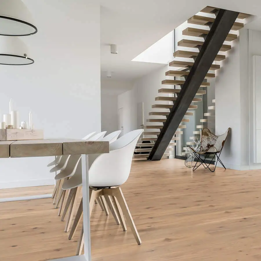 De naturelle kleur laat zich makkelijk combineren met vele andere kleuren en stijlen. Zo kun je gemakkelijk een zeer strak en moderne inrichting met deze vloer combineren. Hoogglans witte meubelen of meubelen met rvs, alles past erbij. Toch liever een klassiekere inrichting? Ook dat is prima te combineren! Al met al vinden wij deze kleur vloer het makkelijkst combineren van alle vloeren.
