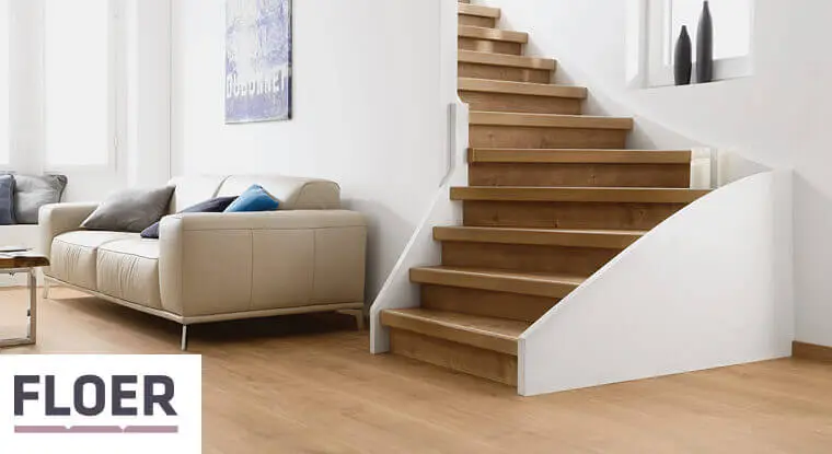Trots presenteren wij de nieuwe Floer traptreden. Deze overzettraptreden zijn te verkrijgen in 4 kleuren die gelijk zijn aan 4 Floer landhuis laminaatvloeren. Het betreft de Floer Landhuis 1026 Lichte Eik, 1027 Natuurlijke Eik, 1029 Onbehandelde Eik en de 1032 Diepbruine Eik. Hierdoor kun je de vloer laten doorlopen in de trap waardoor je een ongelofelijk luxe uitstraling krijgt. De Floer Traptreden zijn te verkrijgen op lengtes van 115 cm en 145 cm en zijn voorzien van een antislip-strip.