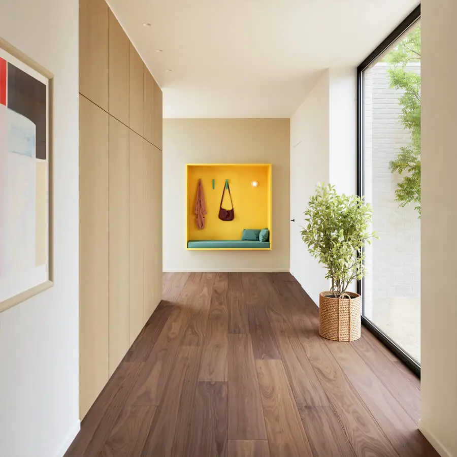 Een belangrijk voordeel van het PARKY Summit Frozen Walnut Premium fineerparket is de duurzaamheid ervan. Het is bestand tegen slijtage, krassen en vlekken, waardoor het ideaal is voor drukbezochte ruimtes zoals gangen, woonkamers en keukens. Bovendien is het PARKY lange planken fineerparket door de gebruikte materialen en verlijming ook zeer stabiel. Hierdoor zijn de Summit parketvloeren minder gevoelig voor krimp of uitzetting als gevolg van temperatuur- of vochtigheidsveranderingen . PARKY fineerparket biedt dezelfde esthetische voordelen als massief houten vloeren, maar dan tegen een lagere prijs. Dit maakt het een betaalbaar alternatief voor mensen die de warmte en schoonheid van hout willen ervaren, maar een beperkter budget hebben. Door te kiezen voor PARKY Summit fineerparket kun je geld besparen zonder concessies te doen aan de kwaliteit en uitstraling van uw vloer.