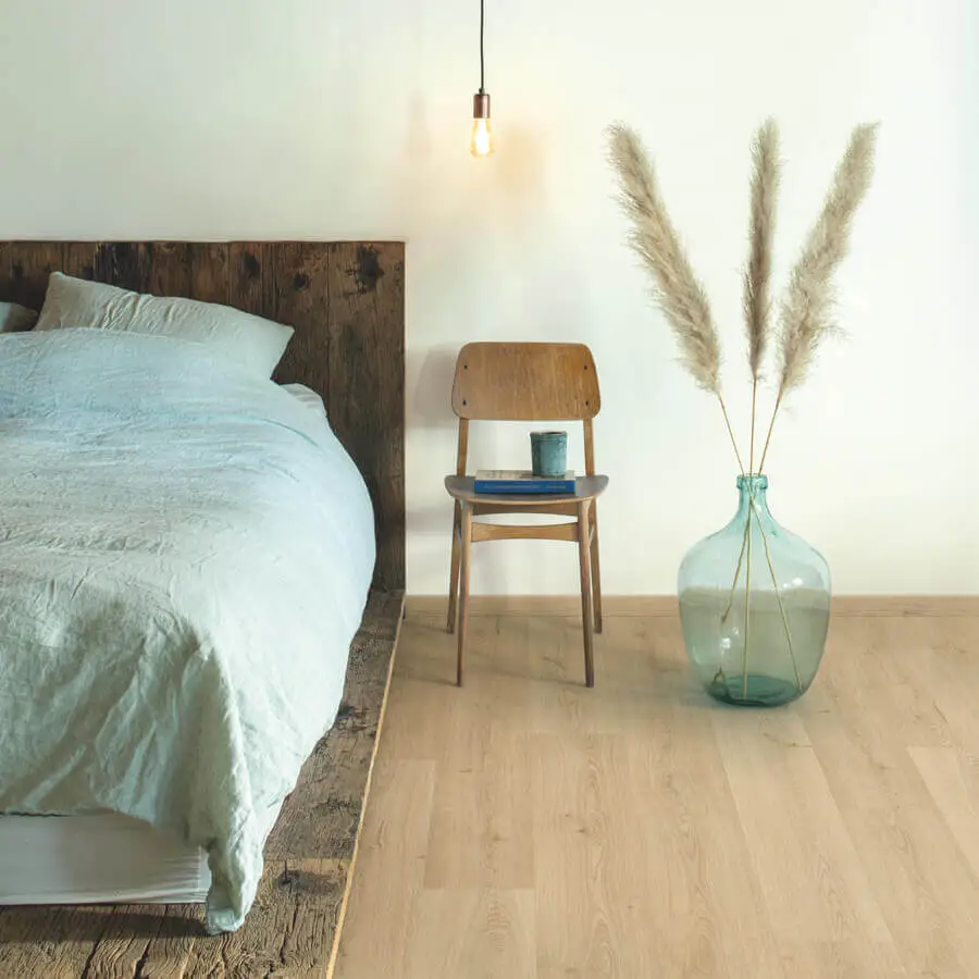 Wil je wat meer rust creëren dan is de gekozen vloer een perfecte keuze. Deze naturel kleurige vloer geeft daarnaast vrolijkheid en energie aan de ruimte en werkt in donkere ruimtes licht verhelderend.