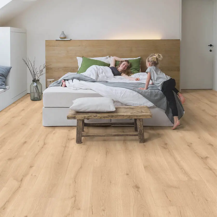 Ook de Quickstep Majestic MJ 3550 Woestijn Eik Licht Natuur laminaatvloer kan in elke ruimte in huis gelegd worden. Je leest het goed, deze prachtige vloer is dus ook geschikt voor de badkamer! Door de waterafstotende HydroSeal toplaag krijgt vocht geen kans om via de toplaag of groef in de vloer te trekken. Natuurlijk is dit ook nuttig in de woonkamer of keuken en hoeven ongelukjes nu dus niet meer het einde van de laminaatvloer te betekenen.